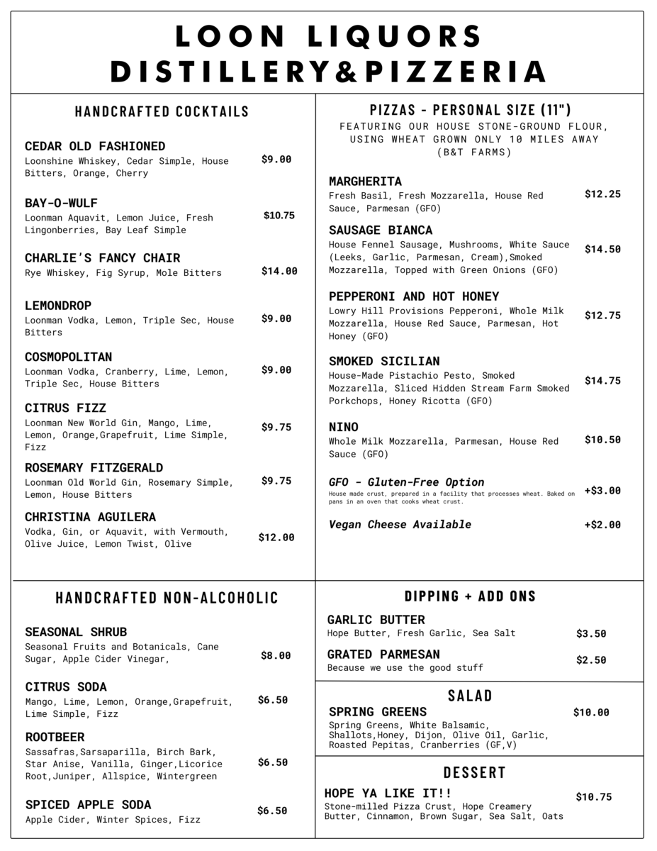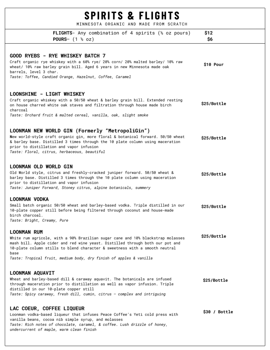 We are looking to redefine the craft spirits experience by offering: Industry-leading tours of our shiny new production equipment, 20+ scratch-made organic spirits, MN’s 1st peat-smoked whiskey, handcrafted cocktails, house-made non-alcoholic drinks, and brick oven pizzas made with flour milled on-site.